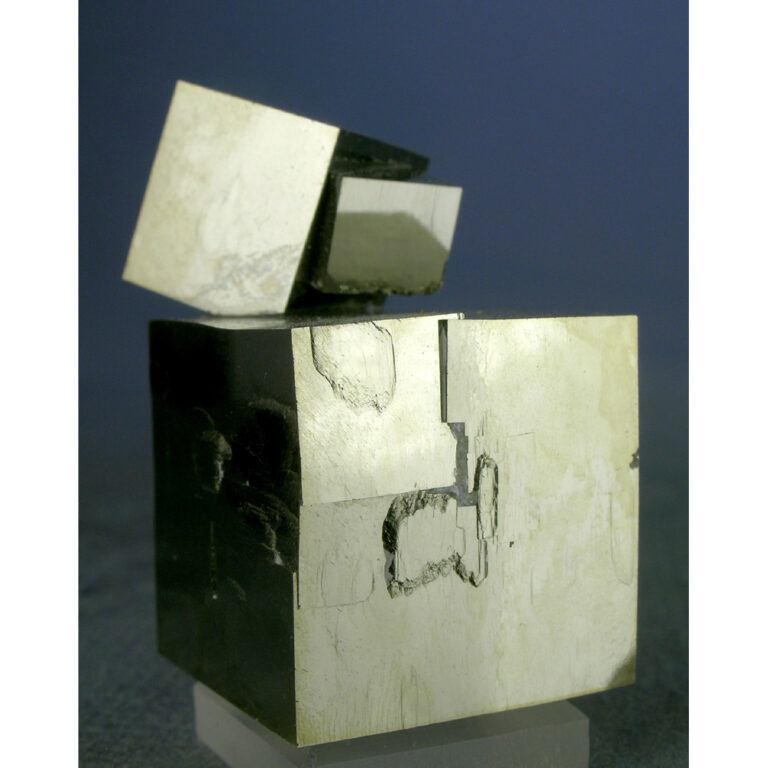 $65.00An amazing and quite beautiful specimen of cubic Pyrite from Spain. It features three MIRROR-BRIGHT cubes of golden Pyrite intergrown with one another to create a fantastic formation that is quite attractive no matter which side you view it from. MUCH SHINIER in person. I purchased this cluster directly from the mine owner, who informed me that virtually all such “chains” of Pyrite cubes from this locality are reconstructed after removal from the hard clay host rock; this piece is no exception. A really choice example of this material, with a very graceful composition that is dazzling all the way around. I’ve included a short VIDEO showing all sides of the specimen to give you a good idea of its three-dimensional shape.