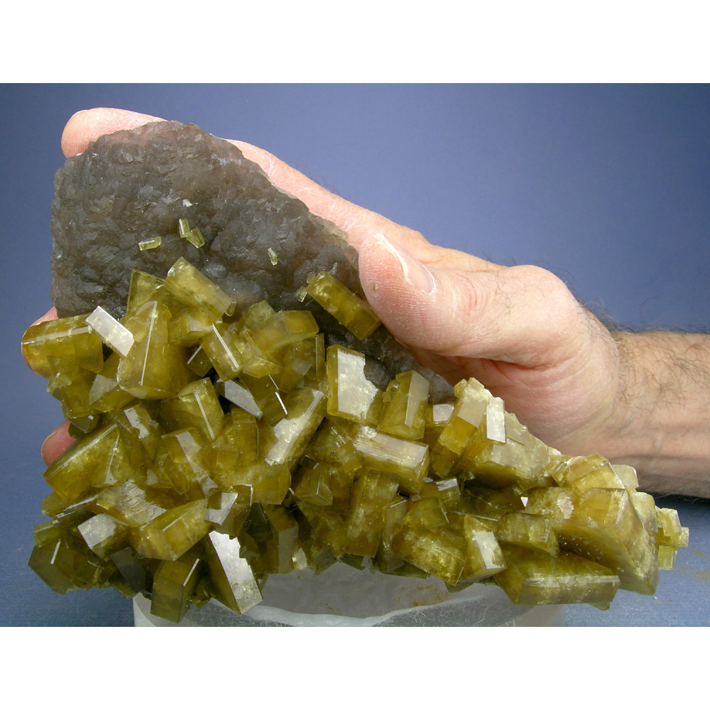 A large and colorful SELF-STANDING Barite/Fluorite specimen from the Xiefang mine in Jiangxi, China. It features a large matrix of purple-ish botryoidal Fluorite which is hosting numerous blocky golden Barite crystals. The Barite crystals exhibit high luster and a wonderful golden color. Lots of amazing details for you to explore all over this very showy display specimen.
