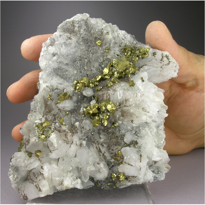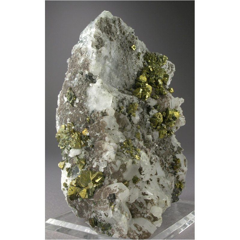 A large and quite brilliant three-mineral combination from the Yaogangxian mine in Hunan, China. It features a large-cabinet sized plate of sharply terminated Quartz crystals which are hosting several groups of superbly crystallized, bright-gold Chalcopyrites. There are also countless tiny wine-red Sphalerite crystals sprinkled over the Quartz, adding a nicely contrasting bit of color to an already impressive composition. SELF-STANDS to display perfectly in either of the positions shown. Guaranteed to delight!