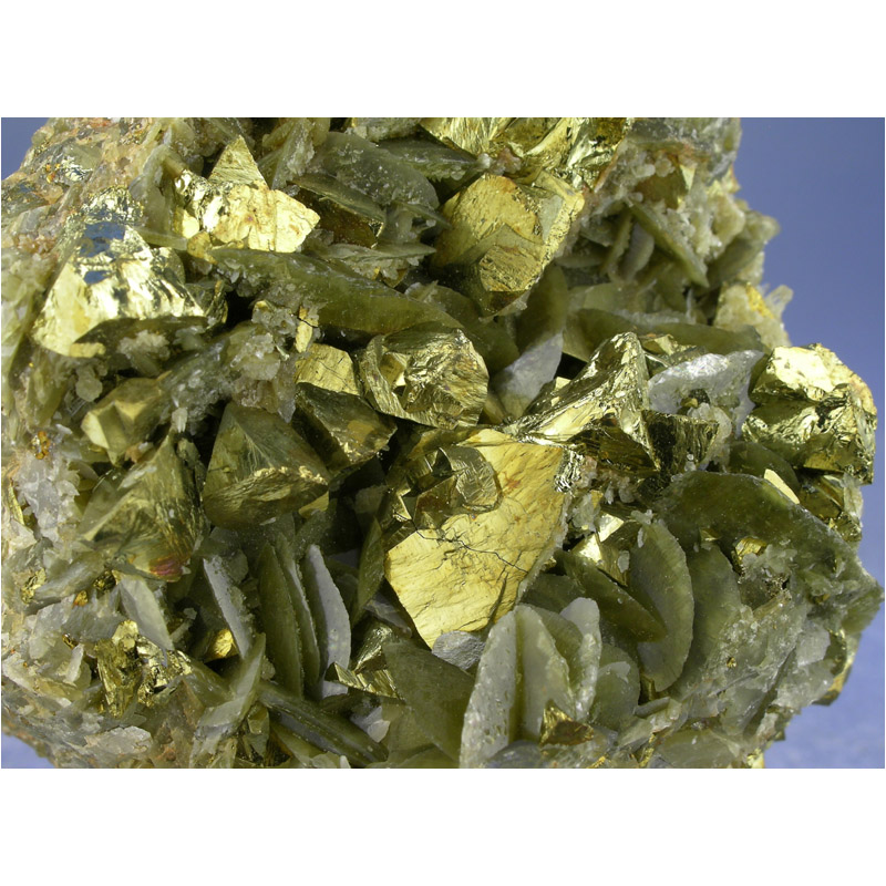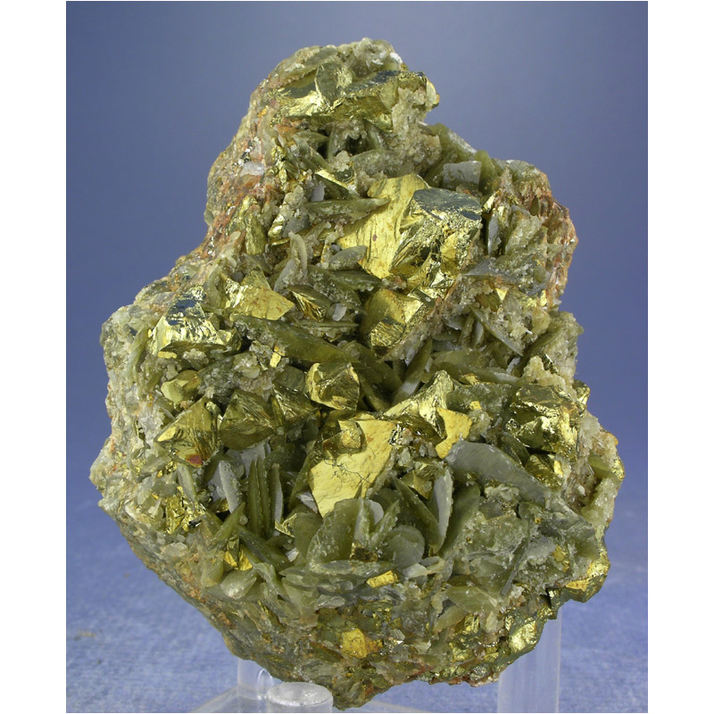 A striking specimen of lustrous olive Siderite with golden Chalcopyrite from Guizhou, China. It features a matrix of greenish-brown Siderite crystals which are hosting numerous sharp and shiny Chalcopyrite crystals. Great color and contrast in a gracefully balanced composition all add up to make this an ideal display piece.