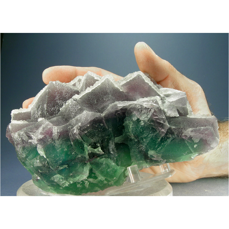 A large and very colorful specimen of Fluorite crystals from De'An in Jiangxi province, China. It features numerous sharply-terminated, green to purple Fluorite octahedrons interjoined to create the nicely balanced formation pictured. A second generation of colorless cubic Fluorite crystals is dusted along the top of the octahedrons as pictured. Backlight reveals the true beauty of this large cabinet-sized specimen: a rich teal-green center with with a coating of rich purple accents above. Loads of fine details for you to explore all over. All in all, a very graceful and colorful composition, worthy of prominent placement in your mineral display cabinet.