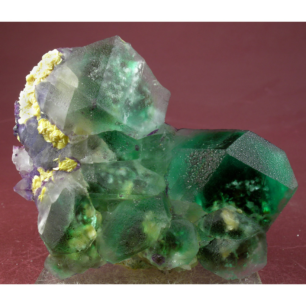 An exceptional specimen of Fluorite crystals with yellow Muscovite from Erongo, Namibia. It features several highly modified, green to purple Fluorite crystals that contain internal phantoms that fluoresce a pinkish color under shortwave UV light (see below). Loads of amazing details for you to explore on this unique jewel.