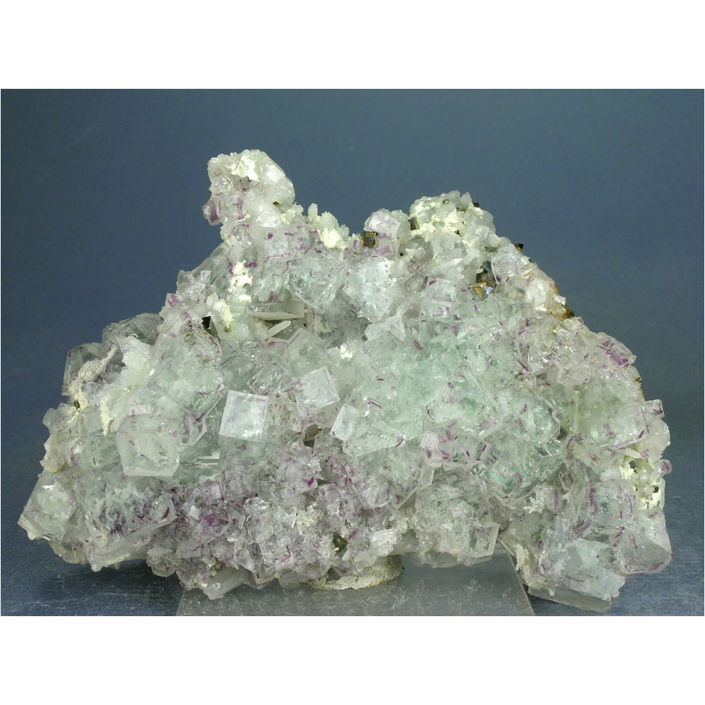 A beautiful old-time specimen of cubic Fluorite crystals with Pyrite from the Shangbao mine in Hunan, China. It features numerous sharp, gem- clear Fluorite crystals hosting a few small cubes of golden Pyrite. The Fluorite crystals are light green with nicely contrasting purple PHANTOM zones inside. Great color and contrast, with lots of fine details for you to explore on all sides. In excellent condition as pictured.