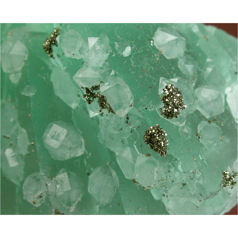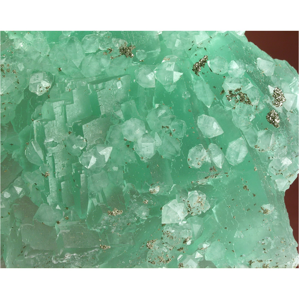 A large and quite colorful specimen of mint-green Fluorite crystals from El Hammam in Morocco. It features a large cluster of interjoined Fluorite cubes which are hosting numerous small Herkimer-like crystals of Quartz and a sprinkling of golden Pyrites. FLUORESCENT under longwave UV light (next photo).