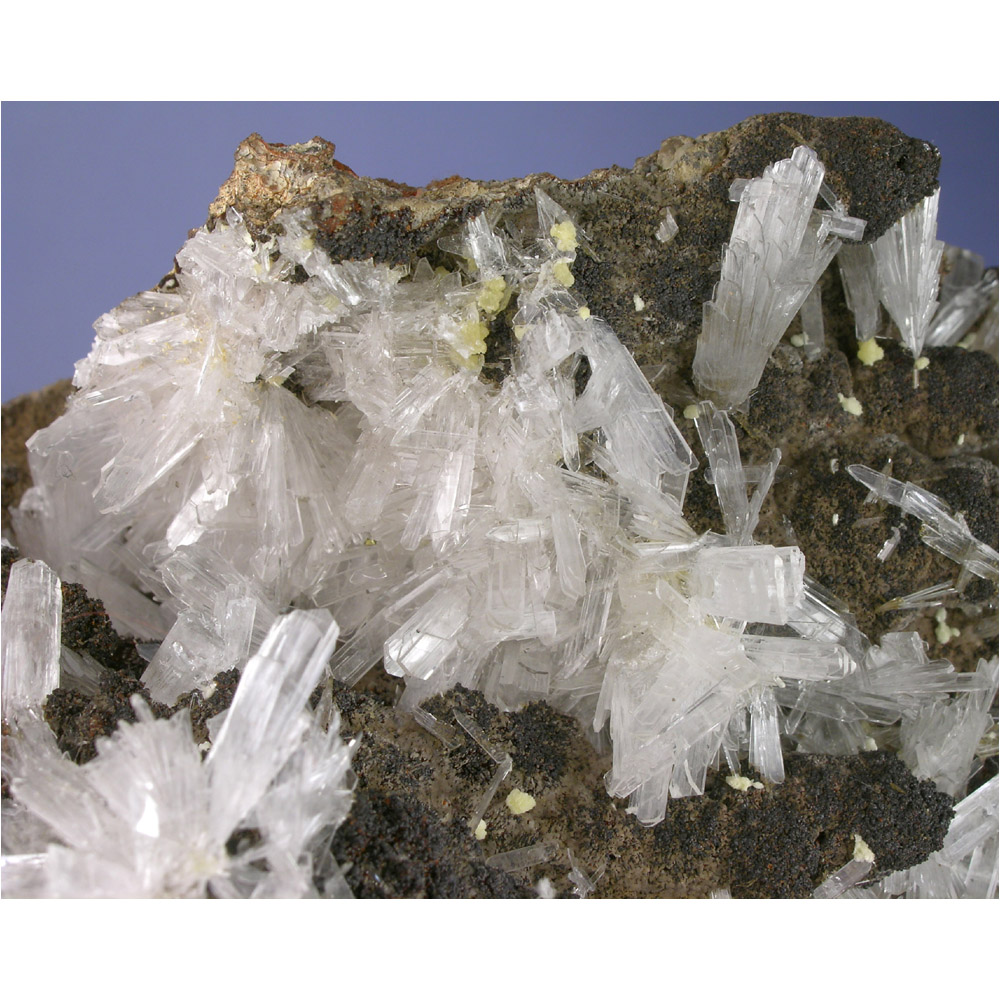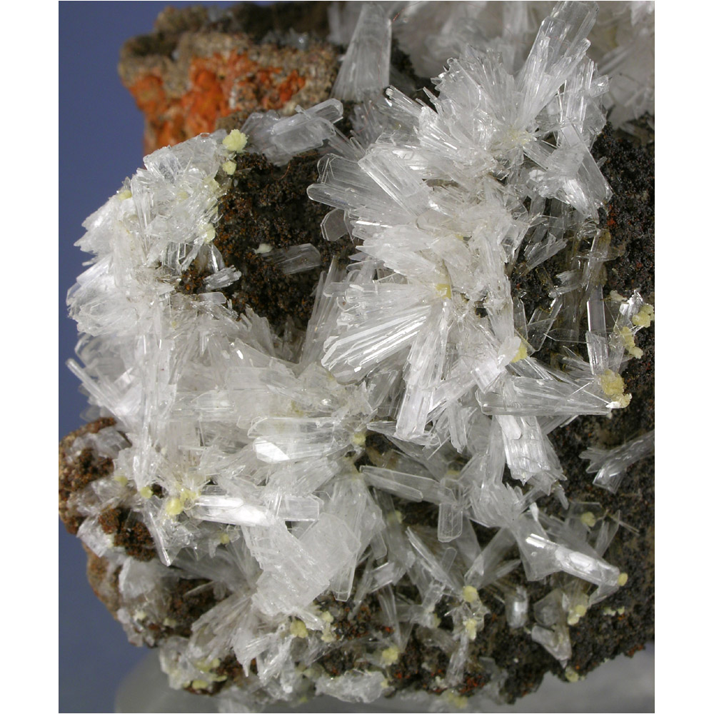 A large and quite brilliant specimen of sharp and shiny Hemimorphite crystals from Mexico. From the 2007 find at Mapimi, it features a reddish Goethite matrix which is hosting numerous brilliant sprays of clear to white, feather-like Hemimorphite crystals. A very nice combination specimen with good color and contrast in a well balanced composition.