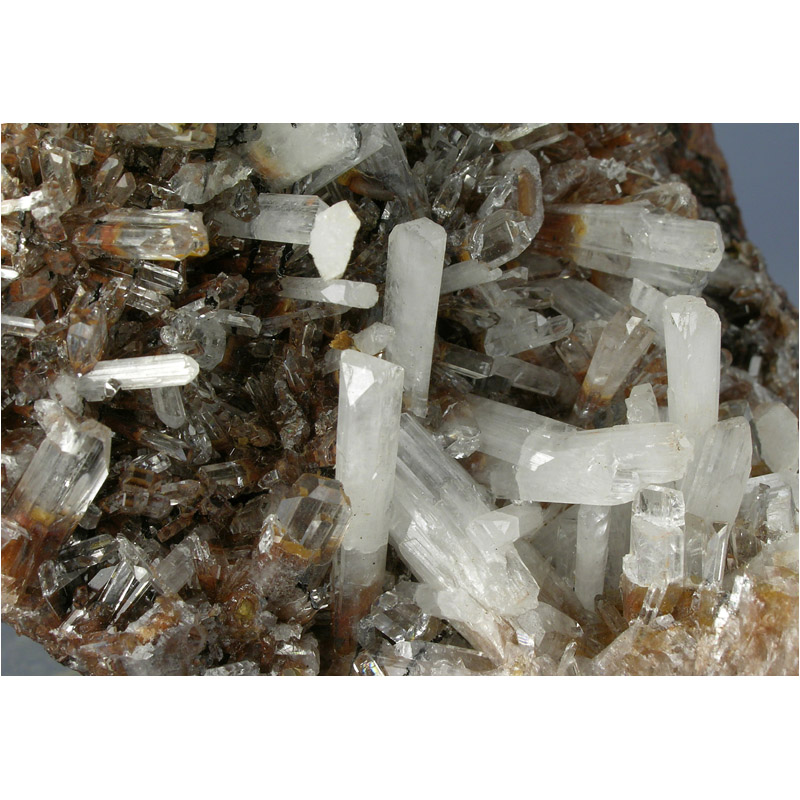 A gracefully composed old-time specimen of sharp clear to white Hemimorphite crystals from Santa Eulalia, Mexico. In excellent condition as pictured, with lots of beautiful details for you to explore on both sides.