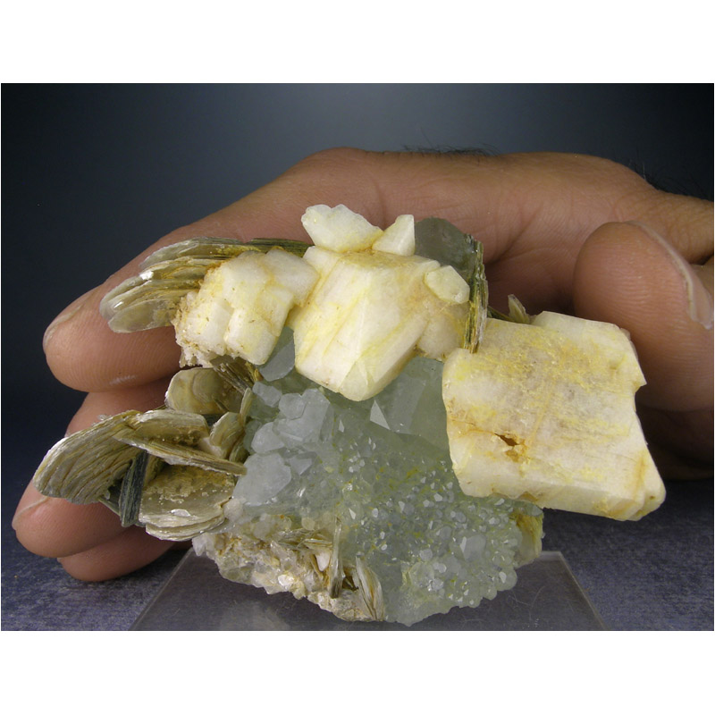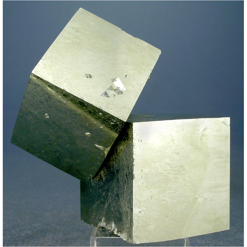 An amazing and quite beautiful specimen of cubic Pyrite from Spain. It features two MIRROR-BRIGHT cubes of golden Pyrite to 3.5 cm. intergrown with one another to create a fantastic formation that is quite attractive no matter which side you view it from. MUCH SHINIER in person. I purchased this cluster directly from the mine owner, who informed me that virtually all such “chains” of Pyrite cubes from this locality are reconstructed after removal from the hard clay host rock; this piece may have one such such repair. A really choice example of this material, with a very graceful composition that is dazzling all the way around. I’ve included a short VIDEO showing all sides of the specimen – note that the video quality is not very good and that the colors in the video are inaccurate, but it will give you a good idea of its three-dimensional shape.