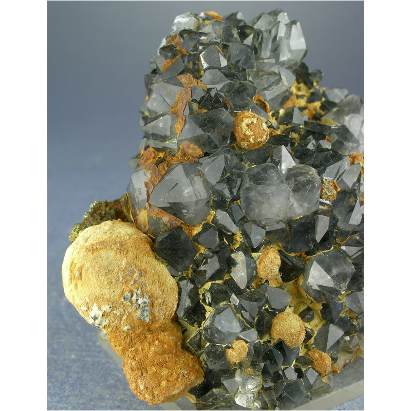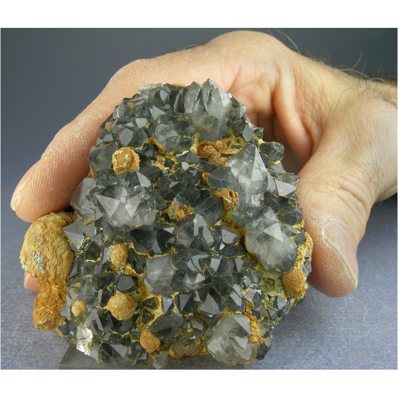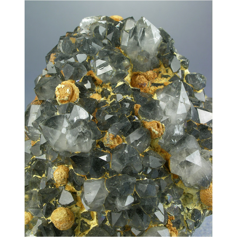 A beautiful old-time specimen of Quartz from Cavnic, Romania. It features a cluster of lustrous gray Quartz crystals associated with balls of nicely contrasting orange Siderite. The Quartz contains countless fibrous inclusions of what is probably Boulangerite or Stibnite, imparting the gray color to the core of the Quartz crystals. These mines are now permanently closed, so don't let this one disappear. In excellent condition as pictured.