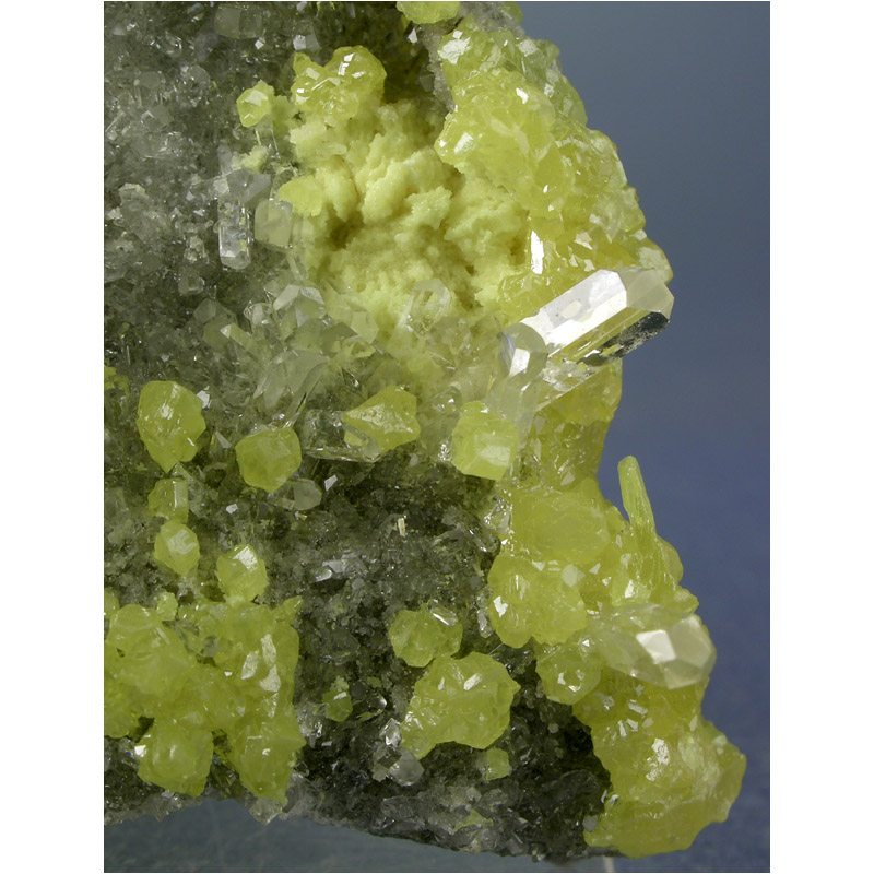 A rare and truly exceptional specimen of Celestite and Sulfur from the Machow mine in Poland. You may know that this locality is no longer producing and in fact has been closed and flooded for over 20 years, so this is a rare opportunity to acquire one of these beautiful old-time specimens. This colorful display piece features numerous canary yellow Sulfur crystals and very GEMMY Celestite artfully positioned over a palm-sized matrix. As the next photo shows, the Celestite displays a lively FLUORESCENCE under both longwave and shortwave UV light. A truly spectacular specimen with gorgeous details, this CLASSIC is sure to brighten up your display cabinet!