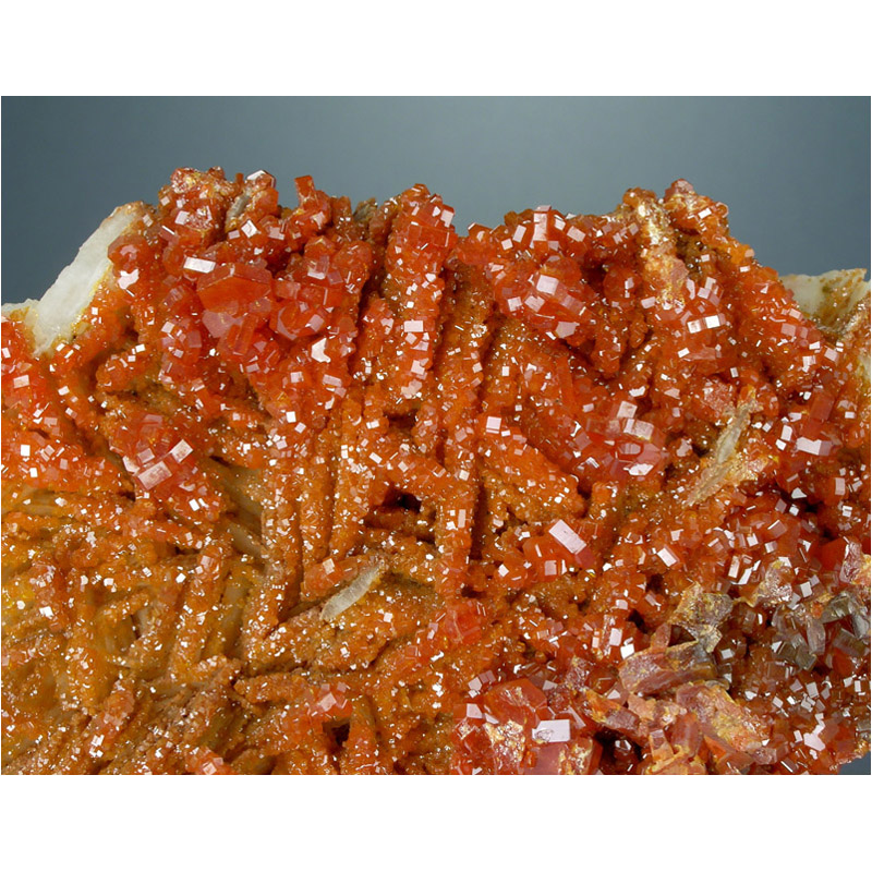 A very colorful large-cabinet specimen of candy red Vanadinite from Mibladen, Morocco. It features numerous super lustrous, vivid red Vanadinite crystals artfully arranged into a very aesthetic formation over a a field of white Barite blades. Lots of amazing details for you to explore, and in excellent condition as the photos show.
