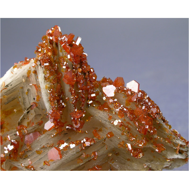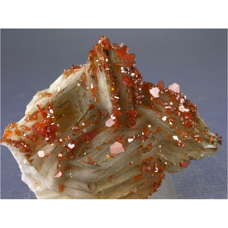 A very aesthetic specimen of GEMMY candy red Vanadinite from Mibladen, Morocco. It features numerous lustrous Vanadinite crystals artfully arranged over a matrix of white Barite. Excellent contrast and absolutely luxurious color in a nicely balanced composition. There’s a lot of Moroccan Vanadinite around, but specimens of this quality re very hard to come by.
